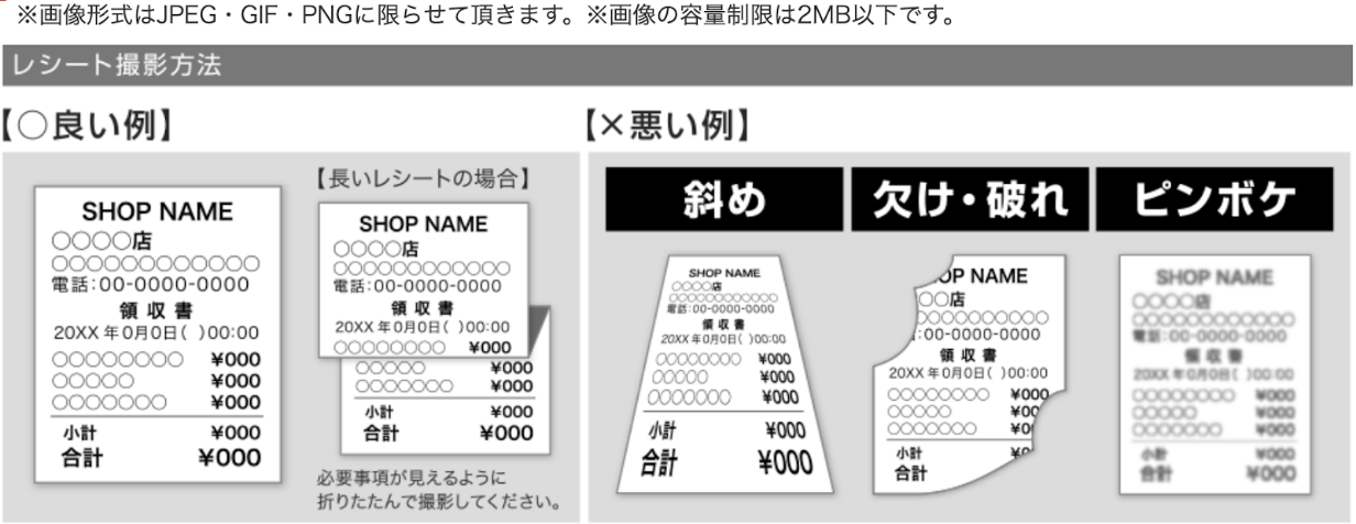 ※レシート全体(①ご購入店舗名 ②ご購入日 ③ご購入時間 ④対象商品・製品名 ⑤ご購入金額)がはっきりと写るように撮影してください。